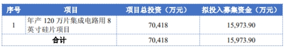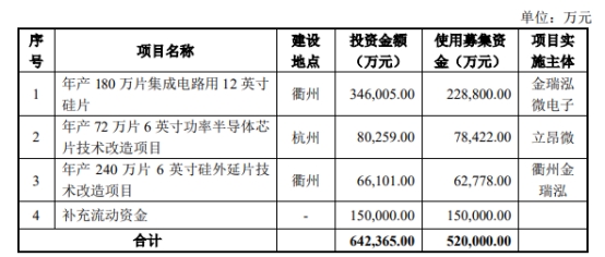 立昂微2021年3月13日发布的2021年非公开发行股票预案显示,公司本次发行募集资金净额将用于年产180万片集成电路用12英寸硅片、年产72万片6英寸功率半导体芯片技术改造项目、年产240万片6英寸硅外延片技术改造项目、补充流动资金。