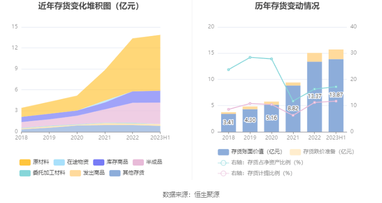 从存货变动来看,截至2023年上半年末,公司存货账面价值为13.87亿元,占净资产的17.18%,较上年末增加4986.24万元。其中,存货跌价准备为1.84亿元,计提比例为11.69%。