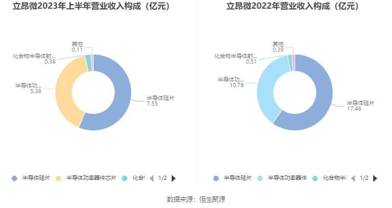 分产品来看,2023年上半年公司主营业务中,半导体硅片收入7.55亿元,同比下降18.48%,占营业收入的56.28%;半导体功率器件芯片收入5.38亿元,同比下降10.69%,占营业收入的40.05%;化合物半导体射频芯片收入0.38亿元,同比增长95.25%,占营业收入的2.86%。