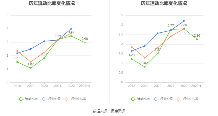 2023年上半年,公司流动比率为2.98,速动比率为2.26。