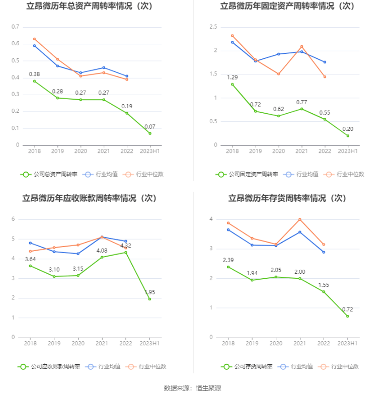 营运能力方面,2023年上半年,公司总资产周转率为0.07次,上年同期为0.11次(2022年上半年行业平均值为0.22次,公司位居同行业15/17);固定资产周转率为0.20次,上年同期为0.36次(2022年上半年行业平均值为0.95次,公司位居同行业15/17);公司应收账款周转率、存货周转率分别为1.95次、0.72次。