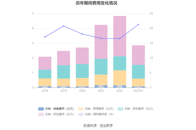 2023年上半年,公司期间费用为2.87亿元,较上年同期增加1.02亿元;期间费用率为21.39%,较上年同期上升9.55个百分点。其中,销售费用同比增长65.1%,管理费用同比增长42.37%,研发费用同比增长5.47%,财务费用同比增长435.22%。