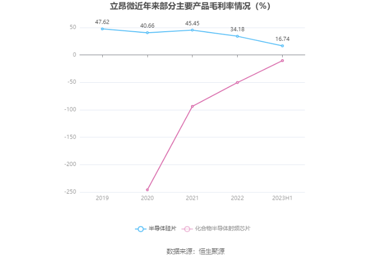 分产品看,半导体硅片、半导体功率器件芯片、化合物半导体射频芯片2023年毛利率分别为16.74%、44.34%、-10.21%。