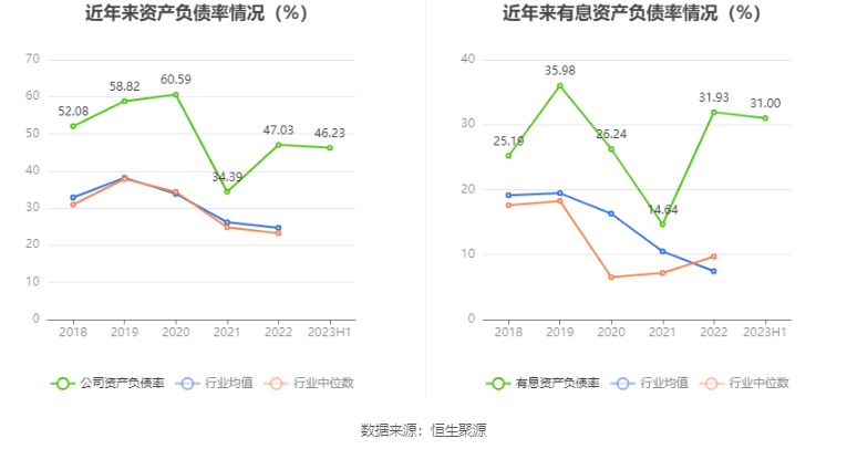 偿债能力方面,公司2023年二季度末资产负债率为46.23%,相比上年末减少0.80个百分点;有息资产负债率为31.00%,相比上年末减少0.93个百分点。
