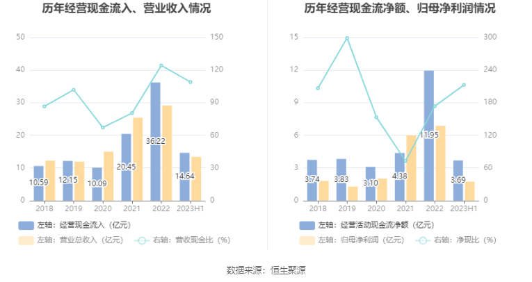 2023年上半年,公司营业收入现金比为109.04%,净现比为212.76%。