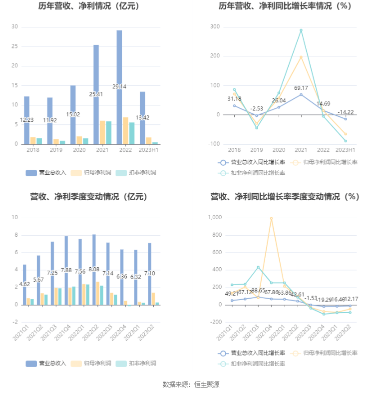 根据半年报,公司第二季度实现营业总收入7.1亿元,同比下降12.17%,环比增长12.30%;归母净利润1.39亿元,同比下降47.51%,环比增长304.25%;扣非净利润2653.36万元,同比下降88.00%,环比增长12.95%。