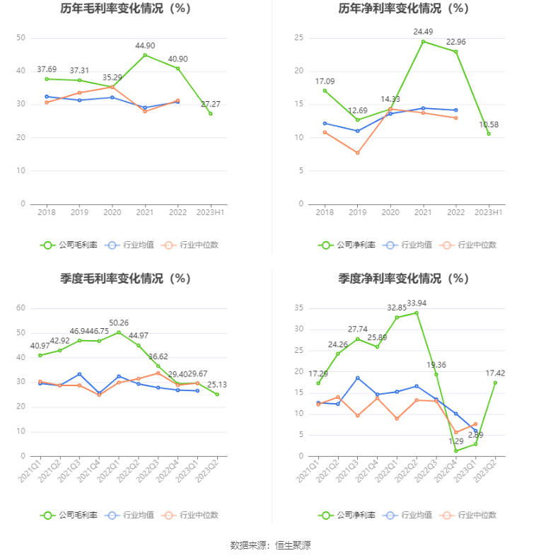 2023年上半年,公司毛利率为27.27%,同比下降20.26个百分点;净利率为10.58%,较上年同期下降22.83个百分点。从单季度指标来看,2023年第二季度公司毛利率为25.13%,同比下降19.84个百分点,环比下降4.54个百分点;净利率为17.42%,较上年同期下降16.52个百分点,较上一季度上升14.53个百分点。