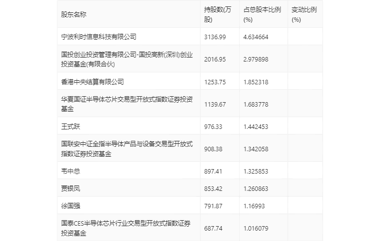 半年报显示,2023年上半年末的公司十大流通股东中,新进股东为国联安中证全指半导体产品与设备交易型开放式指数证券投资基金、国泰CES半导体芯片行业交易型开放式指数证券投资基金,取代了一季度末的陈卫忠、马名希。在具体持股比例上,香港中央结算有限公司持股有所上升,宁波利时信息科技有限公司、国投创业投资管理有限公司-国投高新(深圳)创业投资基金(有限合伙)、华夏国证半导体芯片交易型开放式指数证券投资基金、王式跃、韦中总、贾银凤、徐国强持股有所下降。