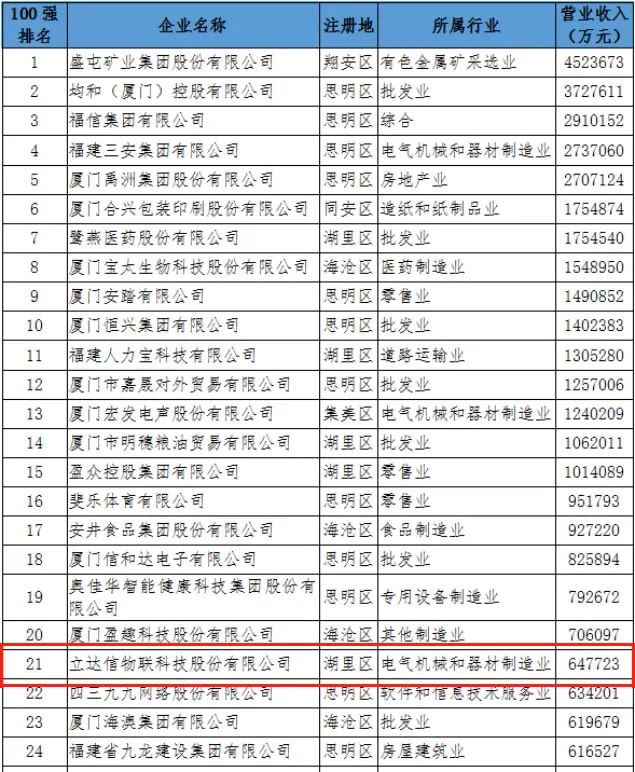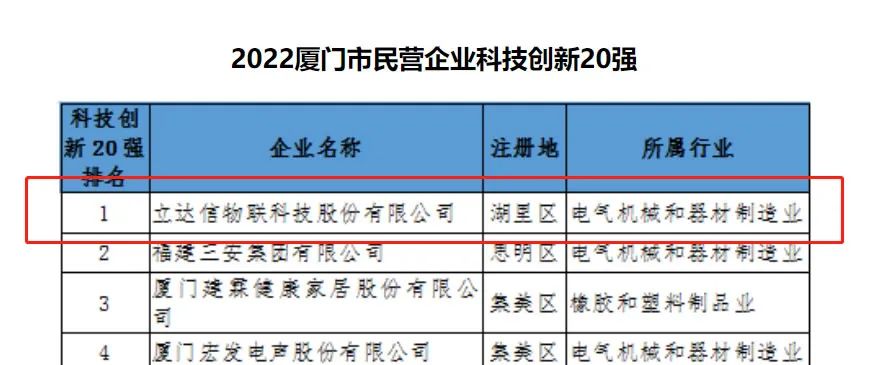 11月1日,厦门市公布了“2022年厦门市民营企业100强”,立达信物联科技股份有限公司入围其中,位列第二十一名。同时出炉的还有“2022厦门市民营企业科技创新20强”和“2022厦门市民营企业制造业20强”,在这两份榜单中,立达信分别位列第一和第八。