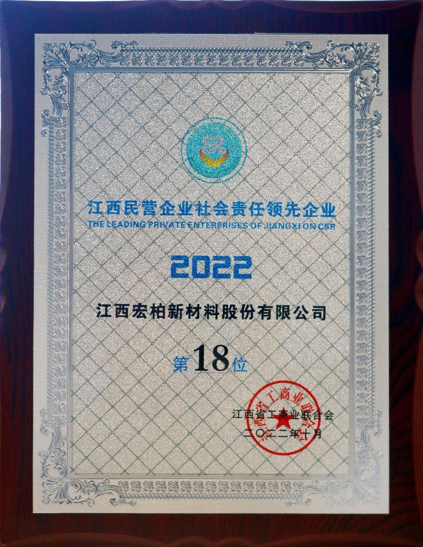 公司在发展壮大的同时,始终不忘初心,积极参加社会公益活动,树立了良好的企业形象。因在促进高质量发展、推动绿色环保研发及发展和公益慈善活动等方面的突出实践,宏柏新材荣获2022年江西民营企业社会责任领先企业,其恪尽社会责任,积极投身公益事业获得社会认可。