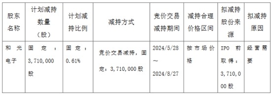 公司股东江西省和光电子科技有限公司(以下简称“和光电子”)拟在减持计划披露之日起15个交易日后的3个月内(即2024年5月28日-2024年8月27日)通过集中竞价方式减持股份合计不超过3,710,000股(即占公司当前总股本的0.61%)。若减持期间公司有送股、配股等股份变动事项,减持股份数量可相应调整。但公司股权激励增发新股、非公开发行股票等引起的股份变动事项,减持股份数量不做调整。