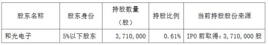 宏柏新材股东和光电子持有公司股份3,710,000股,占公司股份总数的0.61%。上述股份为和光电子在公司首次公开发行股票并上市前取得及公司上市后以资本公积转增股本的股份。