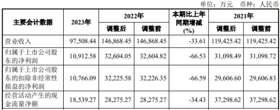 拱东医疗(605369.SH)近日披露的2023年年度报告显示,公司实现营业收入97,508.44万元,同比下降33.61%;归属于上市公司股东的净利润10,912.58万元,同比下降66.53%;归属于上市公司股东的扣除非经常性损益的净利润10,766.09万元,同比下降66.59%;经营活动产生的现金流量净额18,539.27万元,同比下降34.43%。