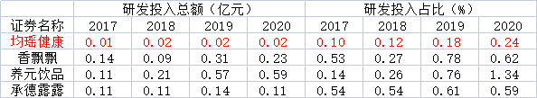 值得一提的是,在均瑶健康主营产品和新赛道产品销量低迷的背后是均瑶健康远低于同行业的研发费用率。2018-2020年,均瑶健康的研发费用分别为150.74万元、221.51万元和200.59万元,2020年均瑶健康的研发投入占比为0.24%,在行业内垫底。