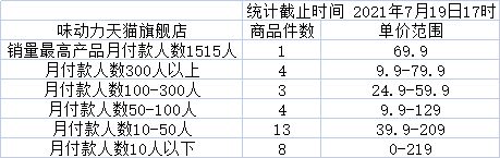 中国网财经记者在均瑶健康的天猫旗舰店-味动力旗舰店浏览发现,均瑶健康的销量并不乐观。截至2021年7月19日17点,店铺粉丝数仅1.2万人,上架33件产品,多款产品的月销量不足百人,产品单价也较低。