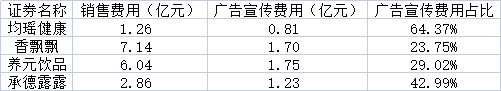 海通证券研报显示,2017年以来,均瑶健康持续加大腾讯视频、优酷视频、爱奇艺视频等新媒体资源投入。均瑶健康广告宣传促销费占销售费用的比率在行业内处于领先水平,2019年和2020年分别为66%和64.52%,2020年同行业公司中香飘飘、养元饮品和承德露露的该费用占比分别为23.75%、29.02%和43.99%。