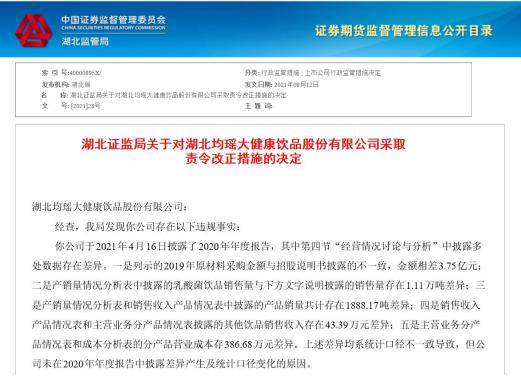 8月17日,均瑶健康发布公告称,公司于2021年8月16日收到中国证券监督管理委员会湖北监管局下发的《湖北证监局关于对湖北均瑶大健康饮品股份有限公司采取责令改正措施的决定》。湖北证监局发现均瑶健康2020年年报中多处数据存在差异,并要求其在2021年8月30日前修正2020年年报中的相关信息,并在2021年8月30日前提交书面整改报告。