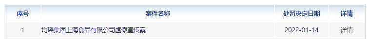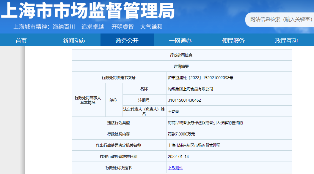 近日,上海市市场监督管理局网站公示的均瑶集团上海食品有限公司虚假宣传案(沪市监浦处〔2022〕152021002038号)显示,均瑶集团上海食品有限公司因对商品或者服务作虚假或者引人误解的宣传,被上海市浦东新区市场监督管理局罚款7万元。