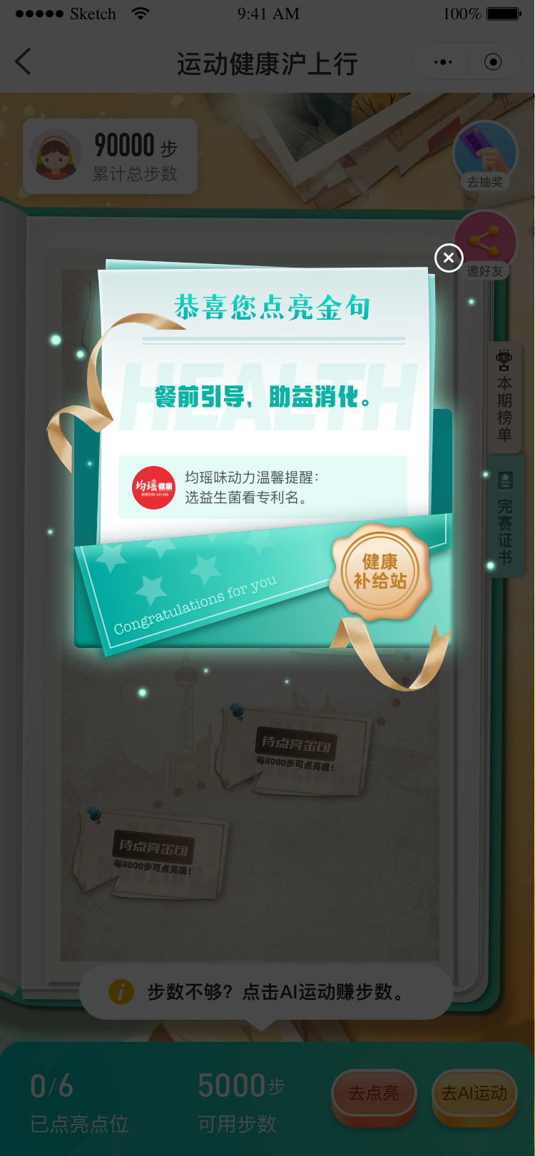 活动期间,参与者每累积8000步可随机选择点亮任一点位图标,还可参与当期AI项目换步数,增加点亮机会。每点亮一个图标,可获取该点位对应健康科普知识,体验金句专业、有趣、时尚的表达方式,实现更大范围的传播与推广。积极参与“运动健康沪上行”百万市民线上打卡活动,拿出行动,坚持运动,点亮金句,就有机会抽取到赞助商们提供的有益奖品哦!
