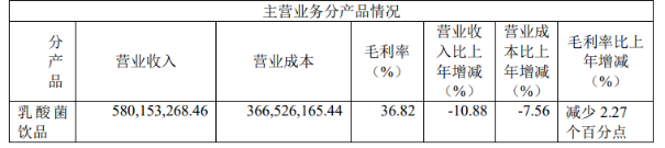 证券之星注意到,2020年,均瑶健康的乳酸菌饮品收入达到7.7亿元,营收占比超九成,是公司的核心收入来源,但该年乳酸菌饮品收入较上年大幅下降了35.16%,连同毛利率也下滑了4.97个百分点。受此影响,公司2020年营收和归母净利润分别同比下滑:31.62%和27.6%。均瑶健康解释称,疫情叠加市场竞争激烈下市场的系统性风险导致公司业绩下滑。