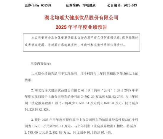 7月14日,湖北均瑶大健康饮品股份有限公司(以下简称“均瑶健康”)发布2025年上半年业绩预告,核心财务指标呈现显著下滑态势:归母净利润预计盈利区间为597.29万元至895.93万元,较上年同期大幅下降74.23%至82.82%,利润减少额达2580.34万元至2878.98万元;扣非后净利润预计盈利135.61万元至203.41万元,同比降幅更为剧烈,达93.19%至95.46%,较上年同期减少2785.09万元至2852.89万元。