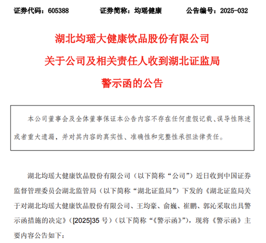 湖北证监局于5月30日下发的警示函显示,均瑶健康4月30日披露的2024年年报中,归母净利润为-2911.64万元,但公司未按规定提前披露年度业绩预告,违反《上市公司信息披露管理办法》。