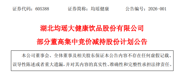 1月15日,均瑶健康(605388.SH)发布部分董高集中减持的公告,董事朱晓明、董事兼副总经理罗喜悦、副总经理向卫兵、财务负责人崔鹏以及董秘郭沁计划在本减持计划公告披露之日起15个交易日后的3个月内,拟通过集中竞价方式减持。