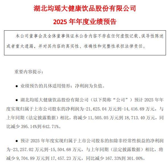 日前,均瑶健康发布2025年业绩预告,预计2025年实现归母净利润-2.16亿元到-1.44亿元,同比减少395.14%到642.71%;预计实现归母扣非净利润-2.33亿元到-1.55亿元,同比减少167.33%到301.00%。