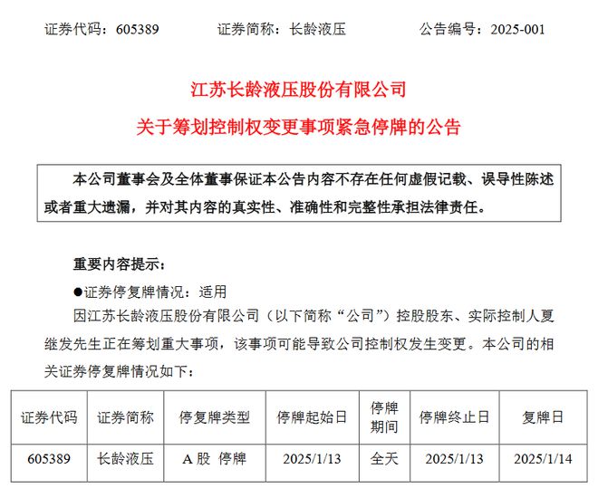 长龄液压表示,鉴于该事项正在洽谈中,尚存不确定性,为保证公平信息披露,维护投资者利益,避免造成公司股价异常波动,根据相关规定,经向上海证券交易所申请,公司股票将于2025年1月13日(星期一)开市起停牌。