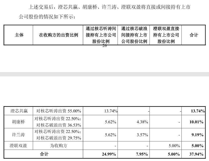 另外,本次交易的资金来源中,还包括有核芯互联股份转让款约5.36亿元。这是核芯互联创始人胡康桥联合许兰涛,拟向新澄核芯(与澄芯共赢的实际控制人同为江阴市高新区国资办)转让核芯互联不低于33.50%股权所得的税后资金,目前交易双方已签署《股权转让协议》。