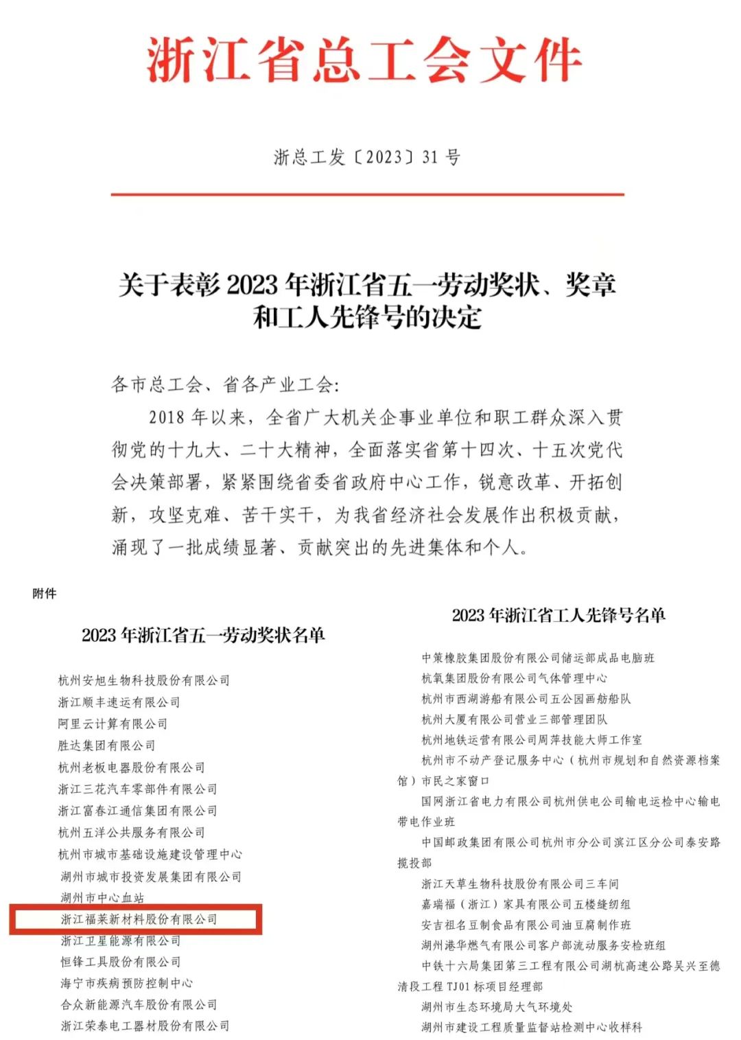 近日,省总工会印发《关于表彰2023年浙江省五一劳动奖状、奖章和工人先锋号的决定》,授予120个先进集体“浙江省五一劳动奖状”荣誉称号,浙江福莱新材料股份有限公司位列其中。