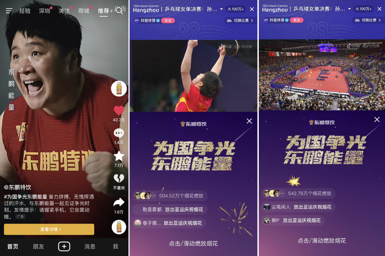 作为杭州亚运会官方指定功能饮料,东鹏特饮特别联手杭州亚运会抖音赛事直播,首创“夺冠烟花”限定特效,在中国队夺胜时刻诚邀全民一起“点燃”夺冠烟花,共同见证中国健儿“为国争光”的高光时刻。此外,东鹏特饮打造了一支《为国争光东鹏能量》创新TVC,并将其调制成“震动模式”,用体感“震醒”观众,创意十足,给用户留下了深刻印象。