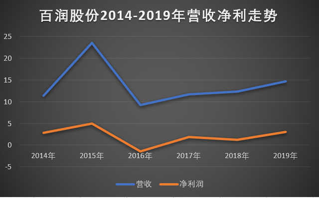 从百润股份的近年财务数据可以看出,其营收和净利润在2015年达到顶峰,分别为23.51亿元和5亿元,其后在2016年跌入谷底,营收仅为上年的1/4,为9.25亿元,净利润也从盈转亏,为-1.47亿元。