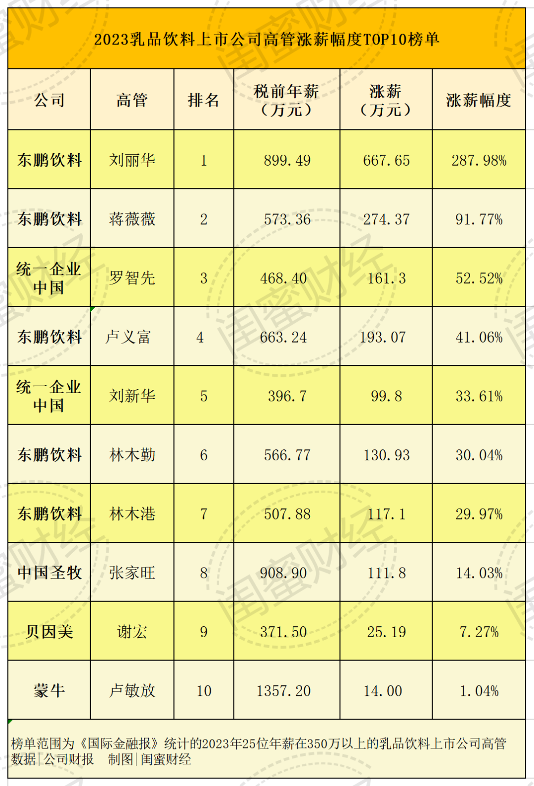 具体来看,2023年涨幅最高的是东鹏饮料时任董事、副总裁、董事会秘书刘丽华。