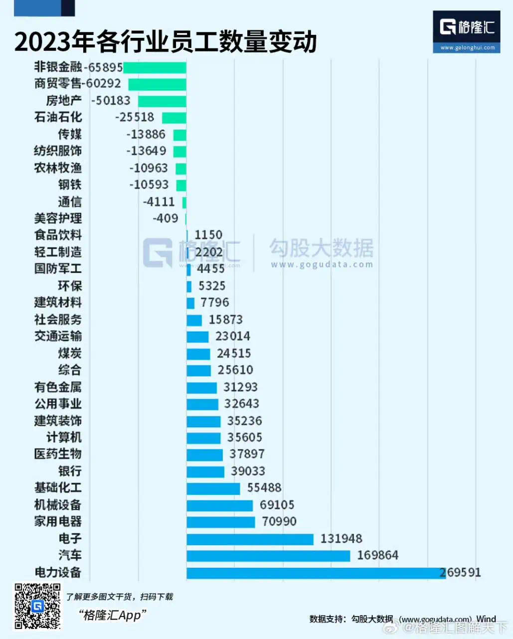 近期,有不少盘点上市公司2023年报的内容,能让我们从不同维度了解各行业的情况。如各行业员工人数的变动。