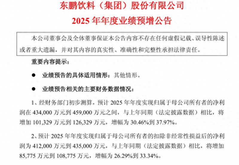 1月13日,东鹏饮料还发布了2025 年年度业绩预增公告,其预计2025年实现营业收入207.6亿元到211.2亿元,与上年同期158.39亿元相比,同比增长49.21亿元到52.81亿元,增幅为31.07%到33.34%;预计实现归属于母公司所有者的净利润在43.4亿元到45.9亿元之间,同比增幅为30.46%到37.97%。