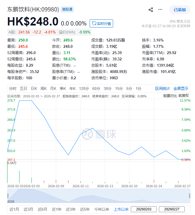 截至周五(2月27日)收市,东鹏饮料(09980.HK)每股收报248.0港元,较IPO发行价(每股248.0港元)持平,目前总市值约1,391.04亿港元。