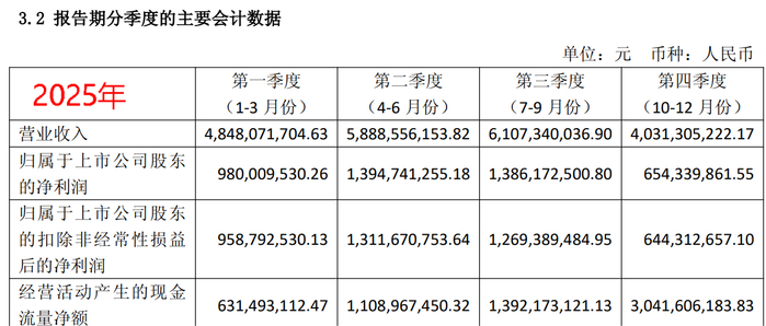 单季度业绩断崖式下滑。2025年第四季度,东鹏饮料实现营收约40.31亿元,同比增长约22.88%,增速较前三季度35%以上的高增速大幅回落;归属于上市公司股东的净利润仅约6.54亿元,同比增速骤降至约5.66%,扣非净利润增速约7.56%,较前三季度30%以上的利润增速可谓是“天差地别”,创下上市以来最差季度盈利表现。