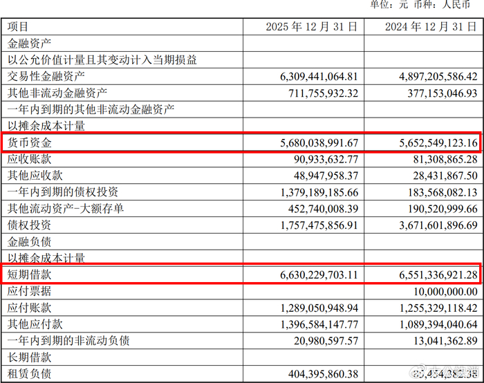 存贷双高,流动性风险爆錶。截至2025年末,东鹏饮料总资产约267.21亿元,总负债约172.97亿元,资产负债率达到约64.73%。一方面,账面货币资金约56.8亿元,另一方面,短期借款高达约66.3亿元,形成典型“存贷双高”格局。