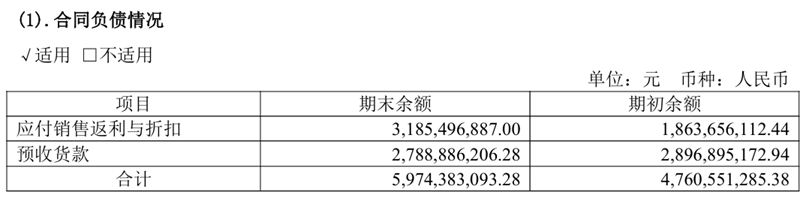 2025年,东鹏饮料的合同负债达到59.74亿元,同比增长25.48%。拆分其合同负债构成可发现,应付销售返利与折扣就达到31.85亿元,同比增长70.93%;预收货款为27.89亿元,较2024年同期反而略有减少。