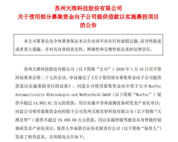 【仪表网企业动态】1月17日,天准科技(688003)发布公告称,公司于2026年1月16日召开第四届董事会第二十七次会议,审议通过了《关于使用部分募集资金向子公司提供借款以实施募投项目的议案》,同意公司使用募集资金向全资子公司MueTecAutomatisierte Mikroskopie und Me?technik GmbH(以下简称“MueTec”)提供不超过14,963.61万元的借款,用以实施半导体量测设备研发及产业化项目;同意公司使用募集资金向控股子公司苏州天准星智科技有限公司(以下简称“天准星智”)提供不超过19,400.00万元借款,用以实施智能驾驶及具身智能控制器研发及产业化项目。