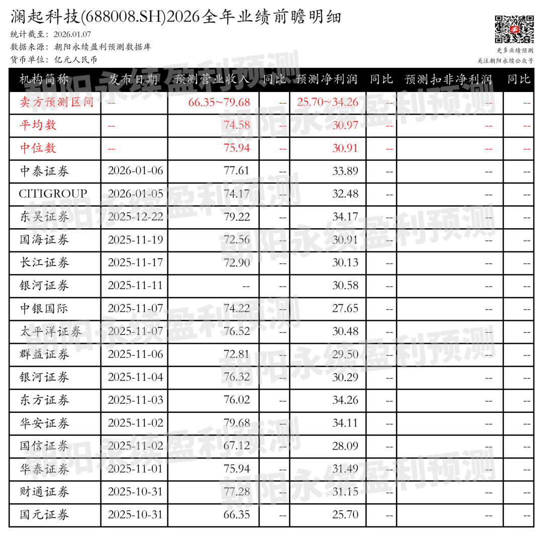 截至2026年01月07日,根据朝阳永续季度业绩前瞻数据: