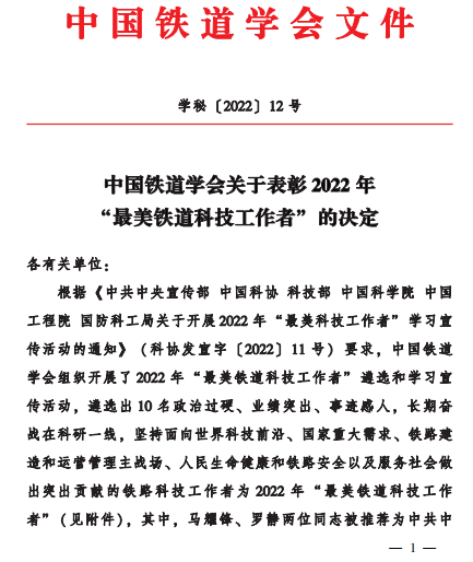 近日,中国铁道学会2022年“最美铁道科技工作者”评选结果出炉,通信信息集团罗静同志获此殊荣,同时被推荐为中共中央宣传部、中国科协、科技部、中国科学院、中国工程院、国防科工局2022年“最美科技工作者”候选人。