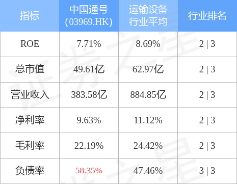 中国通号市值49.61亿元,在运输设备行业中排名第2。主要指标见下表: