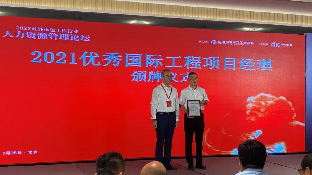 近日,在2022年对外承包工程行业人力资源管理论坛上,中国通号南部非洲区域中心副总经理(主持工作)孙海峰同志获评2021年优秀国际项目经理,中国对外承包工程商会副会长辛修明为孙海峰颁发证书。