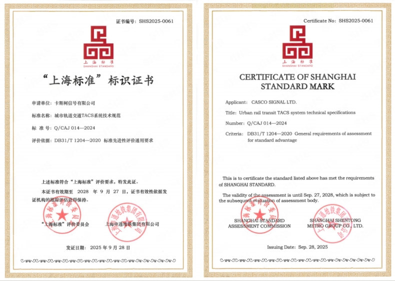 10月29日,上海市市场监督管理局举行2025年“世界标准日”主题活动,发布了12项高水平标准成果,中国通号卡斯柯企标《城市轨道交通TACS系统技术规范》(轨交运行的“智慧大脑”)在众多优秀参评标准中脱颖而出,成功获评“上海标准”,实现了从“技术领先”到“标准引领”的重要突破。