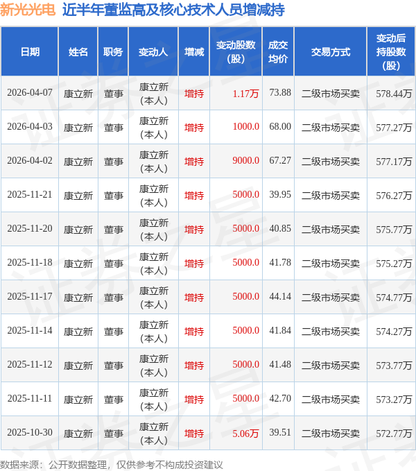 根据4月7日市场公开信息、上市公司公告及交易所披露数据整理,新光光电(688011)最新董监高及相关人员股份变动情况:2026年4月2日至2026年4月7日公司董事康立新共增持公司股份2.17万股,占公司总股本为0.0217%。变动期间公司股价上涨6.84%,4月7日当日收盘报73.92元。