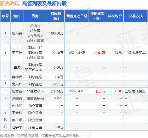 新光光电的高管列表及最新持股情况如下:
