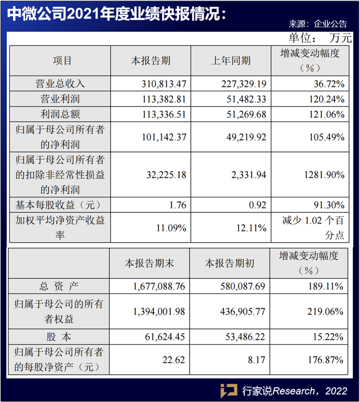 公告显示,中微公司实现营业收入 31.08亿元,较上年同期增长36.72%;归属于母公司所有者的净利润 10.11亿元,较上年同期增长 105.49%;归属于母公司所有者的扣除非经常性损益的净利润为3.22亿元,较上年同期增加 1281.90%。于报告期末,公司总资产为 167.71亿元,较报告期初增加 189.11%;归属于母公司的所有者权益 139.40亿元,较报告期初增加 219.06%。