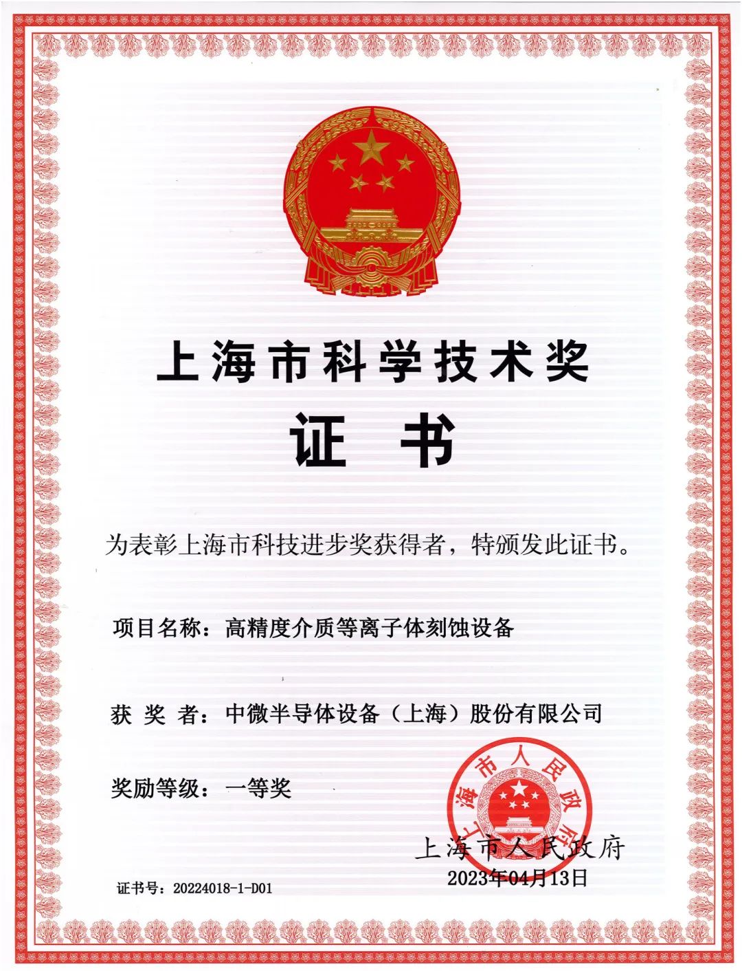根据《上海市科学技术奖励规定》(沪府令18号),通过市科学技术奖评审委员会评审,市科学技术奖励委员会审定,经上海市人民政府批准,2022年度上海市科学技术奖日前隆重揭晓。中微公司“高精度介质等离子体刻蚀设备”项目荣获上海市科技进步奖一等奖。